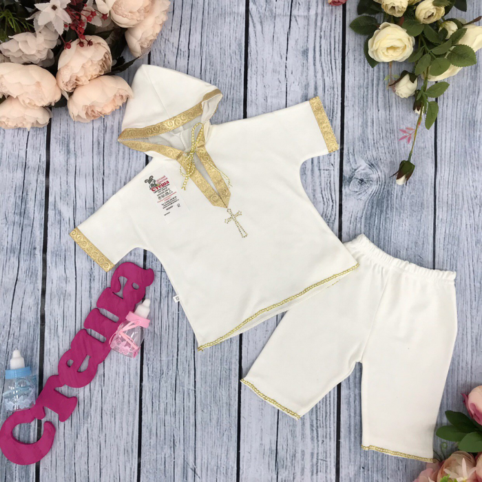 Теги: Купить оптом крестильную рубашку. 215-З. Крестильная рубашка со штанами (золото), интерлок 62,68,74,80 цена,отзывы официальный сайт "Стеша Черкесск"
